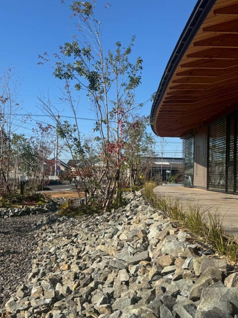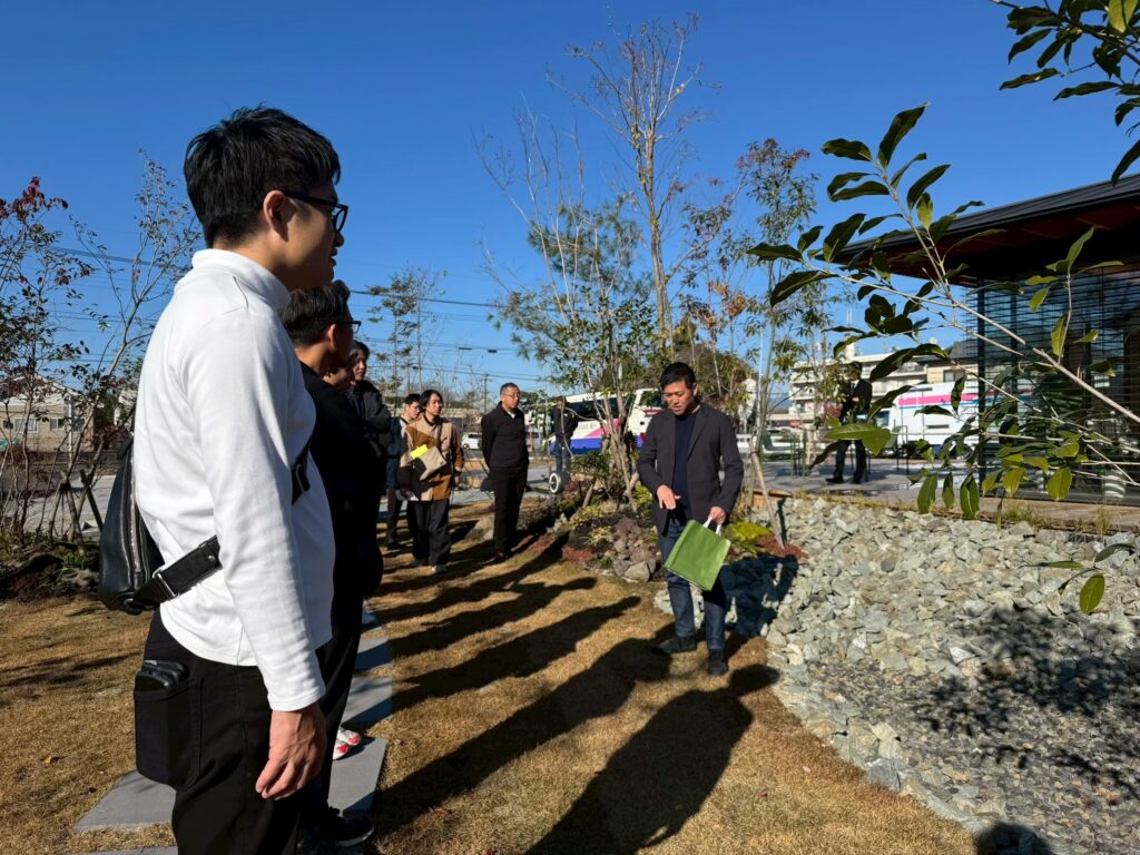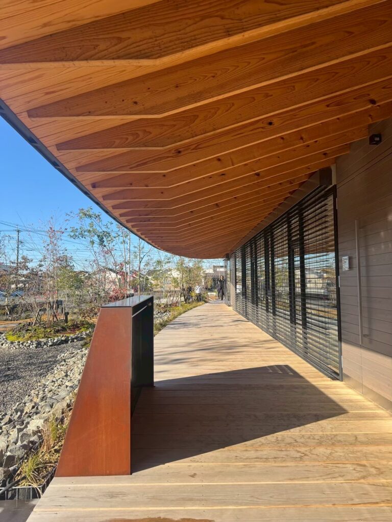 翌日は、「MeTAS」工法の工事途中の現場見学を経て、新社屋「ameterrace」を見学しました。事務所機能にとどまらず、ケーキショップ、打ち合わせスペース、大きな弧を描く半屋外の縁側空間、レインガーデンを中心としたランドスケープが一体的に計画されています。