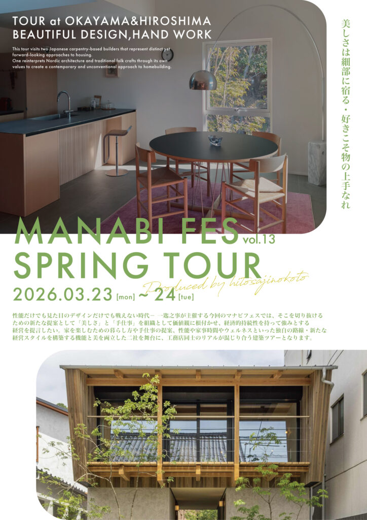前回、参加者満足度100%という大反響で幕を閉じた宮崎での開催から月日が経ち、2026年度1回目となるマナビフェスツアー開催が決まりました!本ツアーは、前回参加者は連続して学ぶことができるテーマがあり、設計・施工・職人誰が来ても見所がある内容となっております。今回の岡山・広島を巡るツアーはどんな面々で、何を得ることができるのでしょうか!?