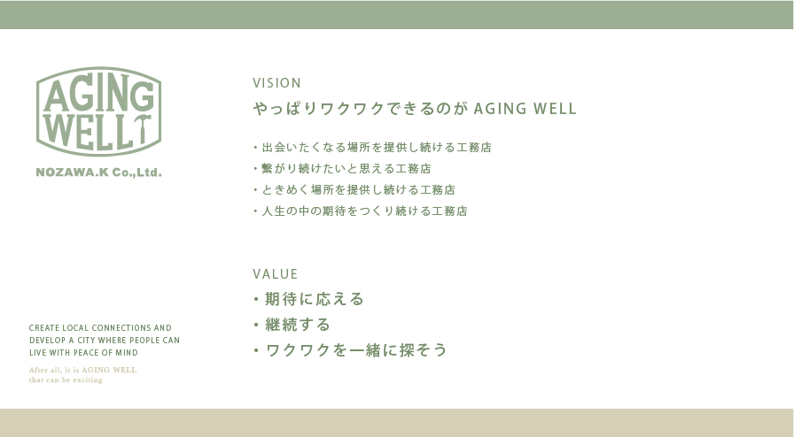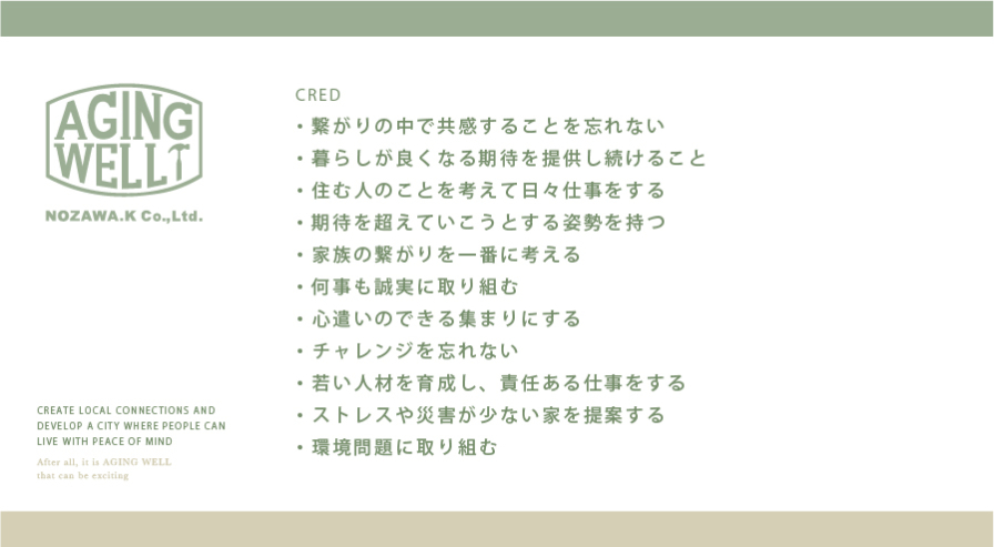 大工としては一流、けれど注文住宅受注における知識が乏しく集客・営業・設計において悩みを抱えておられた野澤建築様との出会いは、ブランディングさせていただいた工務店様からのご紹介でした。お話をしていく中で、全てにおける基本や考えが乏しいため、これを機に全て整えて自社受注を拡大していきたいとの想いをお話しいただき、数年先に控える世代交代を前にブランディングを実施いただきました。大工さんだからこそと言ってもいい、良い家づくりに対するとことんつくり込みたいという姿勢は素晴らしく、自社の特性を活かしたブランディングを実現いただきました。大工が造る木のキッチン(AGING KITCHEN)・ガーデンデザイナーや建築士とコラボして造り込む庭のある家(AGING GARDEN)は、デザイン性と性能を両立した高単価層へのアピールポイントが豊富な強みとなりました。