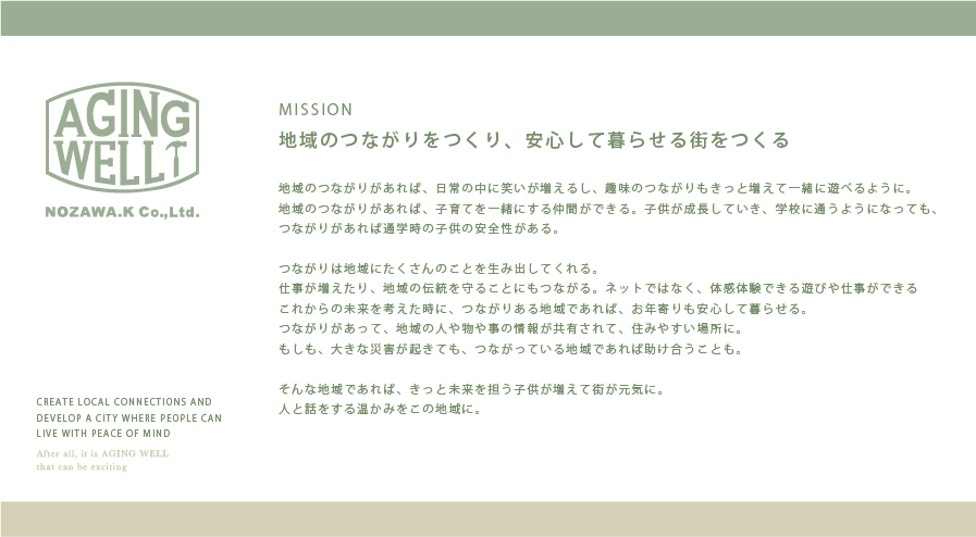 南大阪エリアで長年大工業を営み、地域では大工として名前が通るほどに技術が売りの会社が、次期経営を担う兄弟が修行から戻ってきたことをきっかけに自社受注を請け負う工務店に。高気密高断熱住宅を建築士始めたタイミングでひとさじのことにてブランディングを実施しました。ご兄弟が考えていたAGING WELL(素敵に歳を重ねる家)の理念構築・設計基準作成・施工基準作成などブランディングの基礎を構築させていただきました。