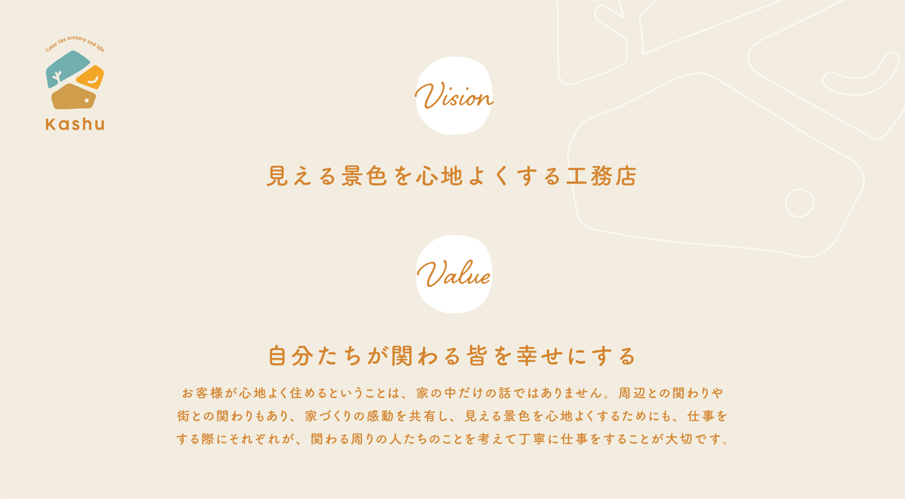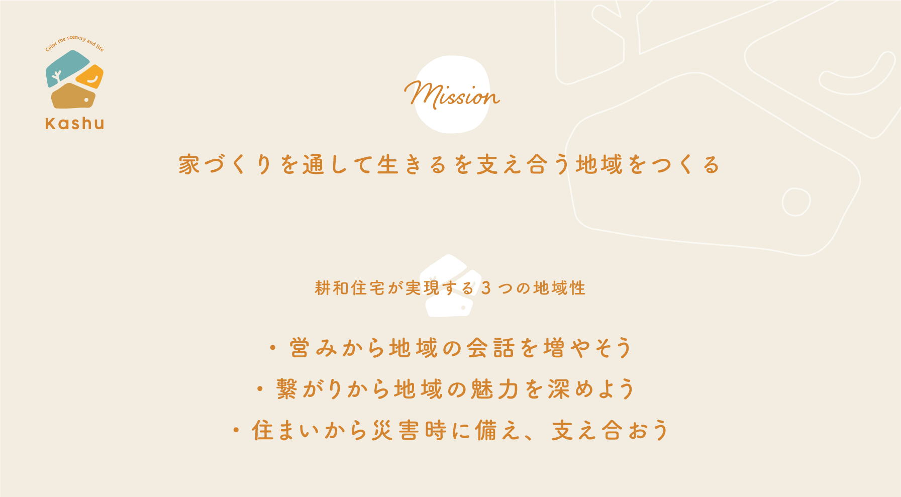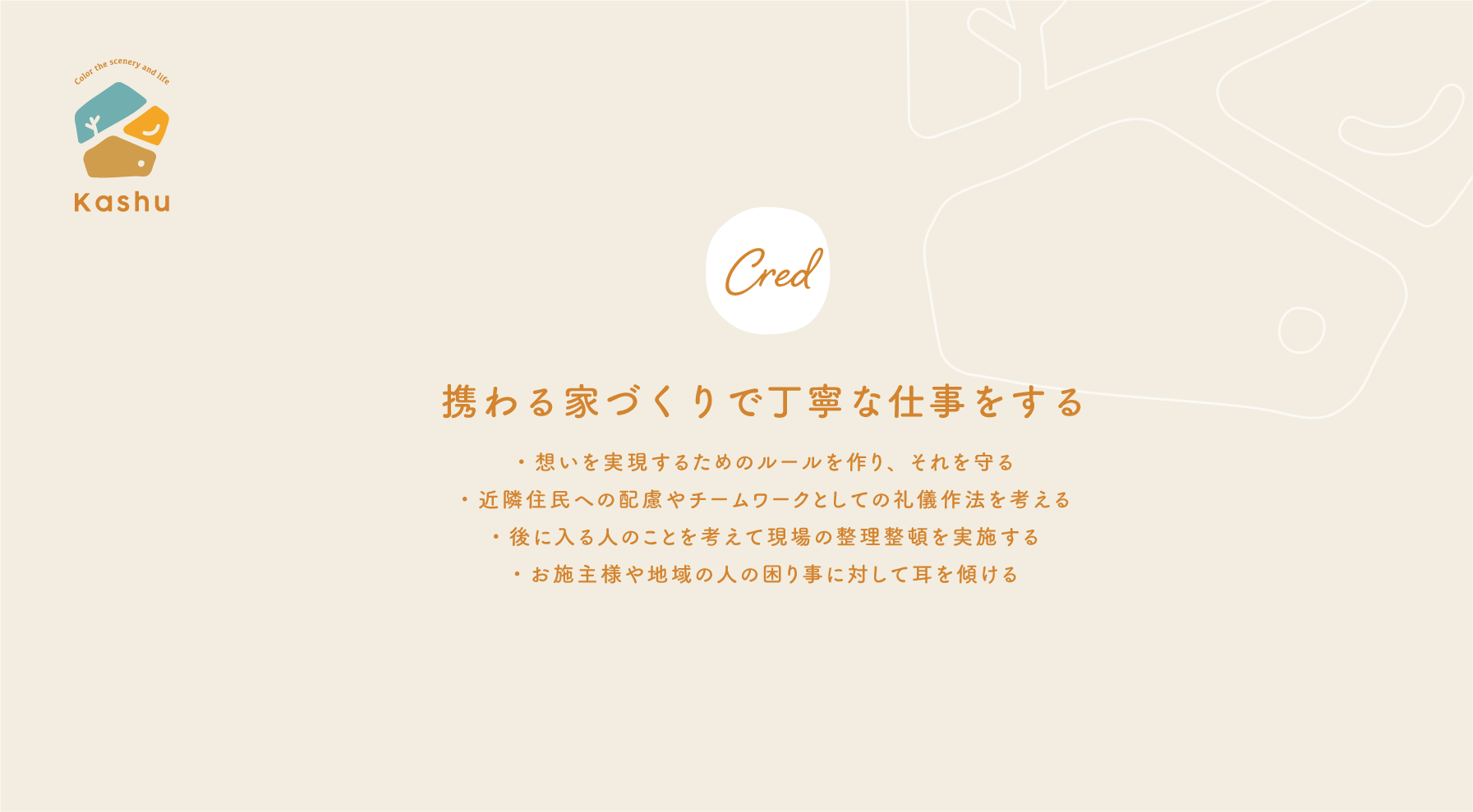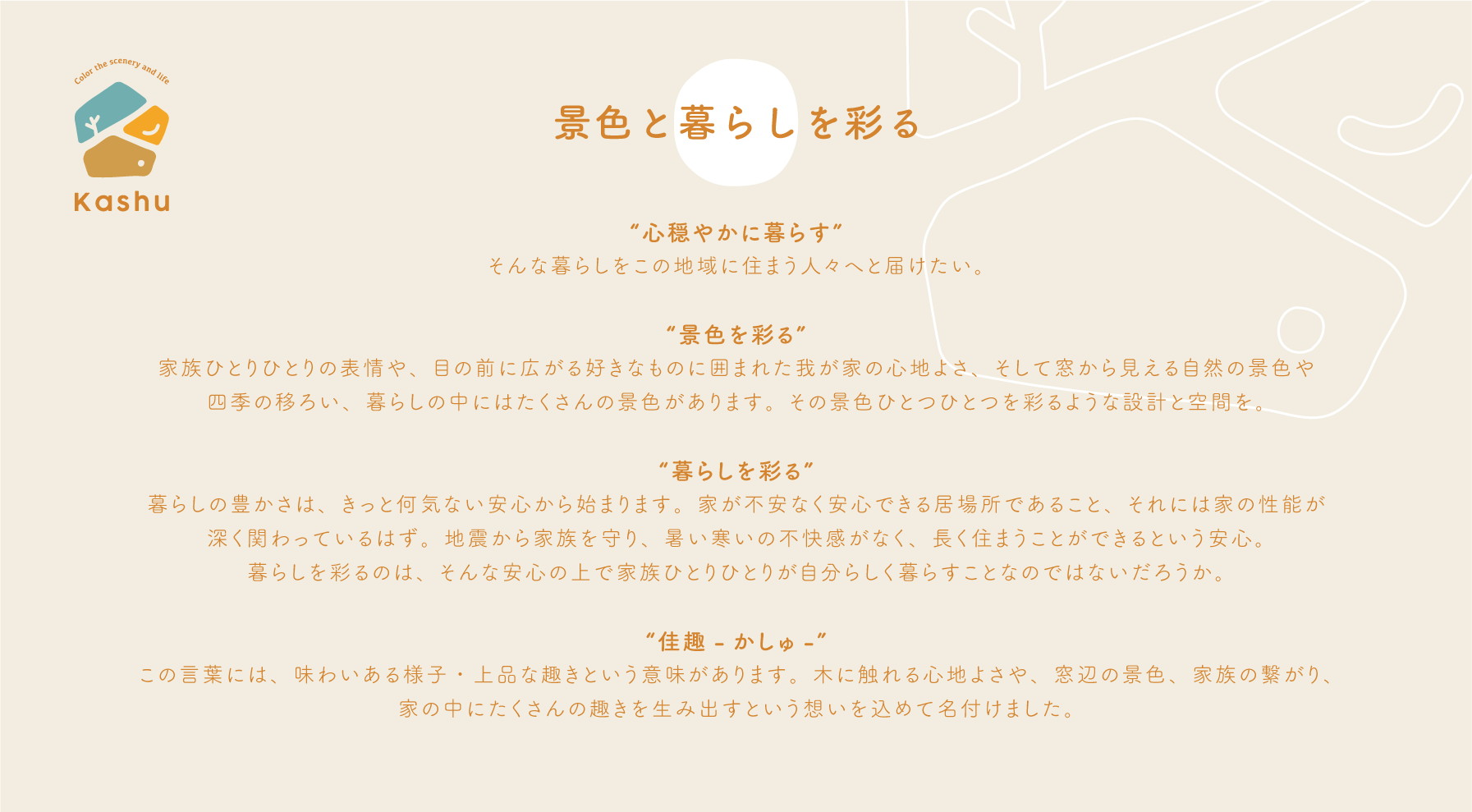 愛知県江南市にて、事業承継を目前にしたタイミングで今後の事業の強みをつくりたいということから始まったブランディング。二代目と共に進めた今回のブランディングは、地域の中での小規模工務店が持つ役割を突き詰めて考えた形となりました。会社の在り方、地域の認知の活かし方、不動産との連動、そして自分達が良いと思う家づくりを形にする中で、注文住宅ブランドKashuが生まれました。